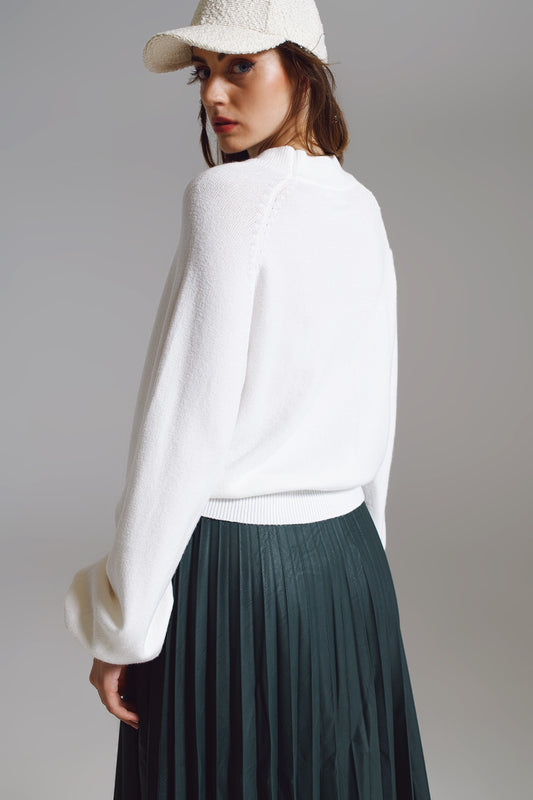 Pull blanc en tricot à col en V avec détails en maille ouverte