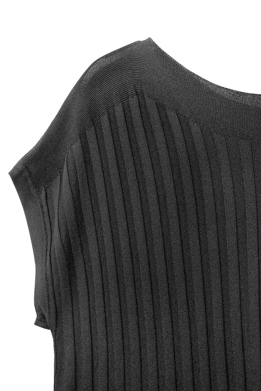 Pull noir surdimensionné à col rond avec des rayures blanches et des fentes sur le côté