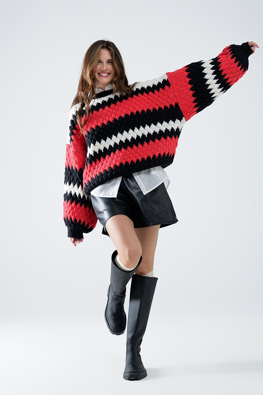 Pull oversize à col montant avec ailes de chauve-souris et rayures en noir et blanc