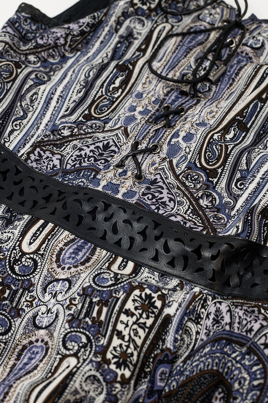 Robe mi-longue à imprimé floral bleu et empiècements au crochet