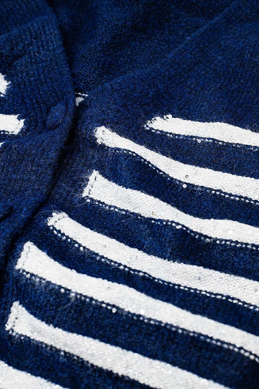 Cardigan bleu de style bohème en maille pointelle à rayures et détails à franges