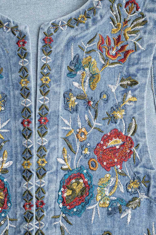 gilet en denim légèrement délavé avec détails en strass sur le col