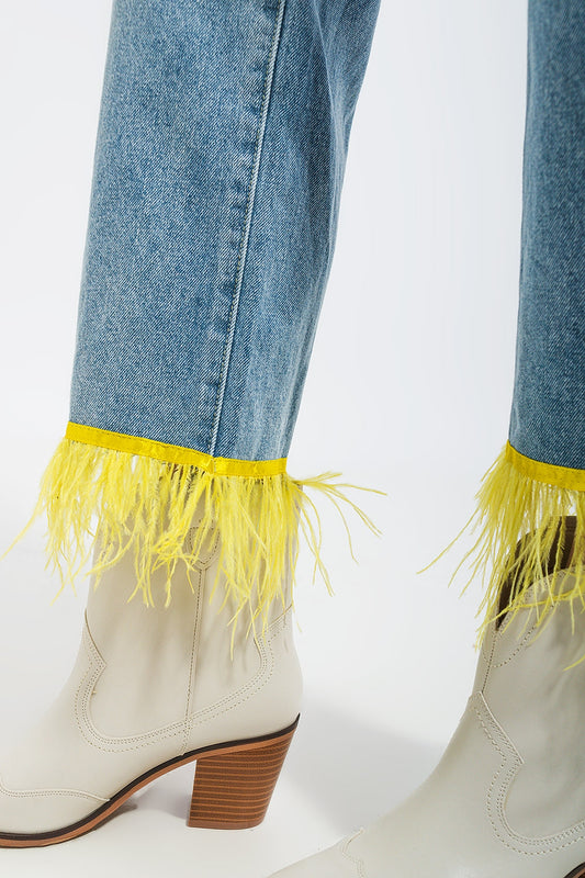 Jean droit d'ensemble avec ourlet à plumes jaunes synthétiques