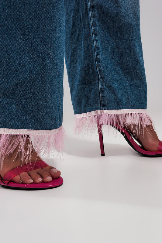 Jean droit d'ensemble avec ourlet à plumes ROSE synthétiques