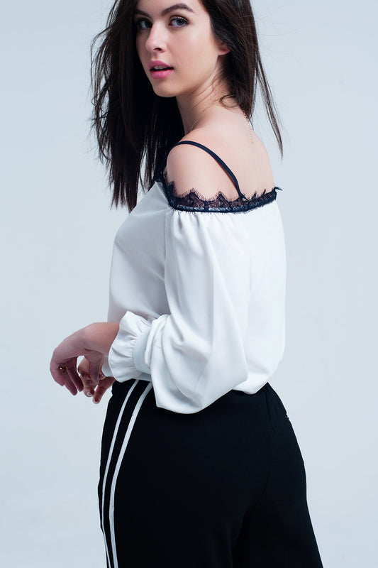 Top blanc avec dentelle noire avec épaules dénudées