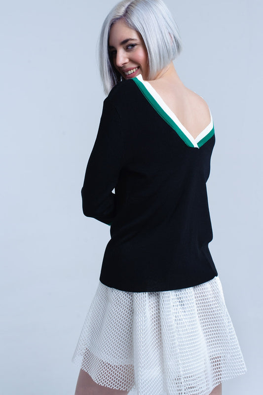 Jersey noir à col en V avec bordure contrastante verte et blanche