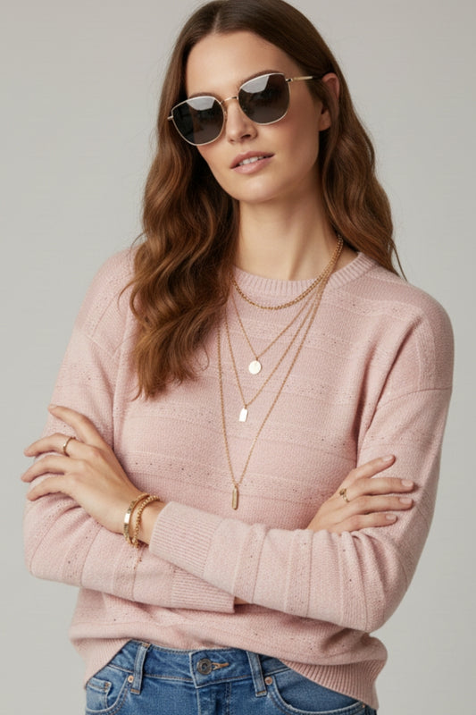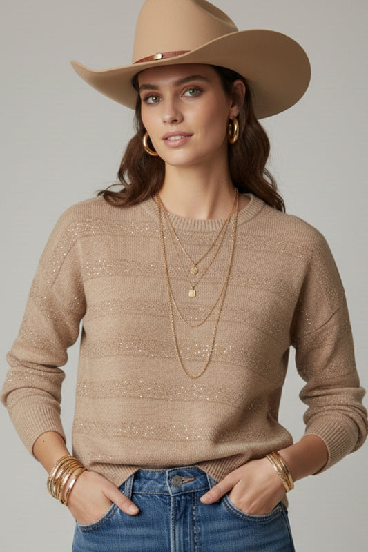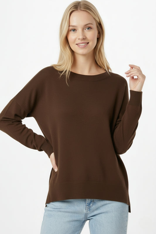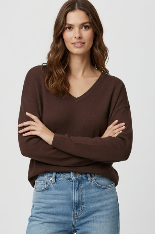 Pull à col en V en maille fine marron avec texture linéaire subtile