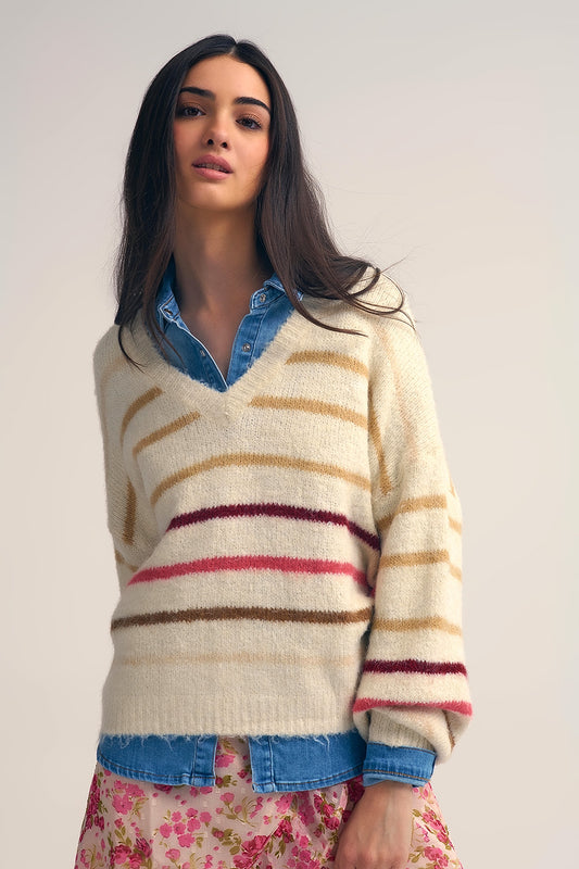 Pull en tricot rayé bleu avec des accents bruns et jaunes