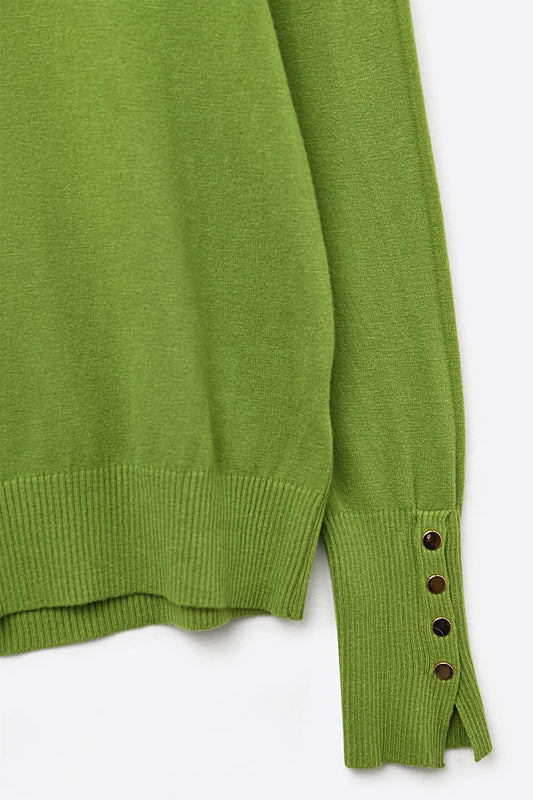 Pull à col roulé vert olive avec boutons dorés sur la manchette