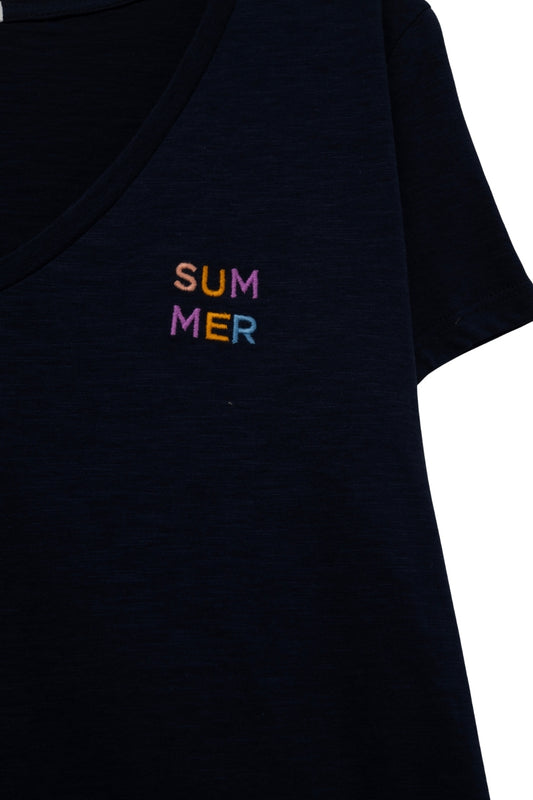 T-Shirt marine avec texte jaune et encolure ras du cou