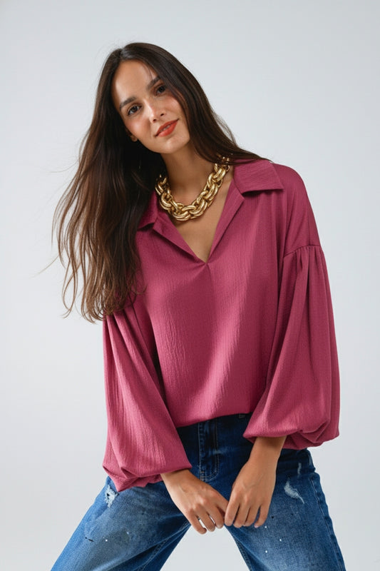 Top à col en V à pois noirs et à volants en mousseline de soie