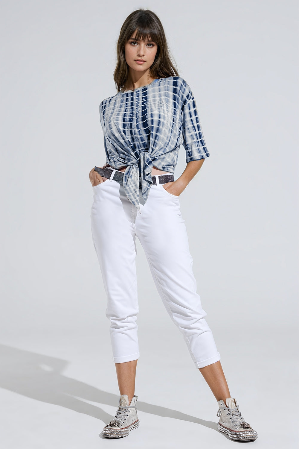 Length: Cropped length. Subcategory: Top. Collar: Crew neckline. Sleeves: Short Sleeves. Print: Tie-dye print. Fit: Relaxed fit. Style: Boho. Fabric: Lightweight woven fabric . Product details: Tie-keyhole front.