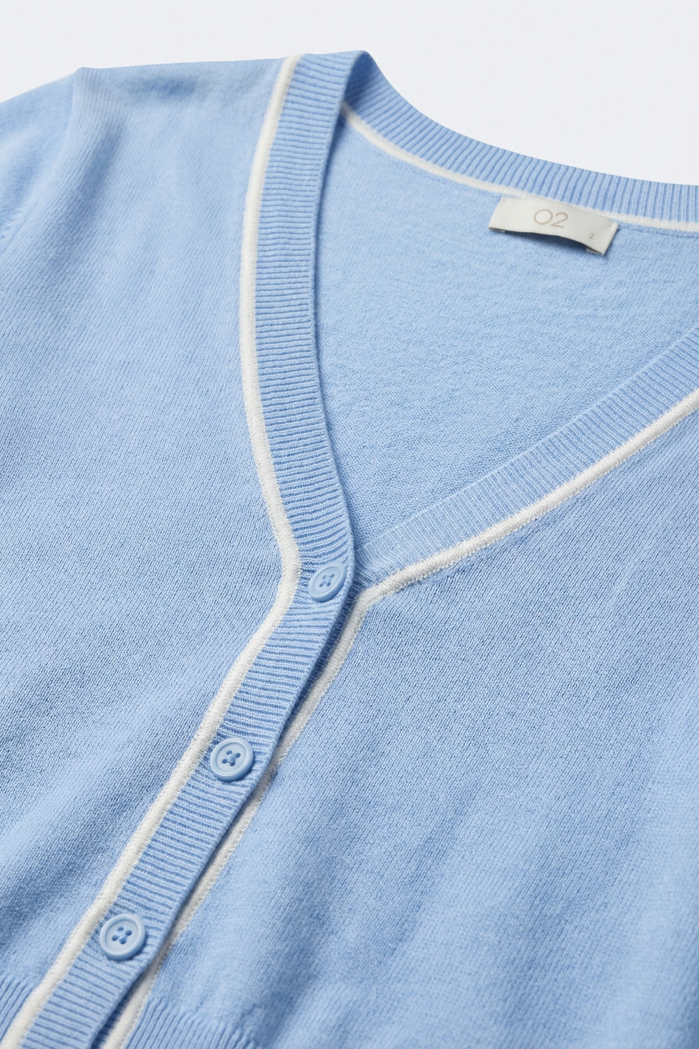 Cardigan en maille fine bleu bébé avec bordure contrastée en blanc