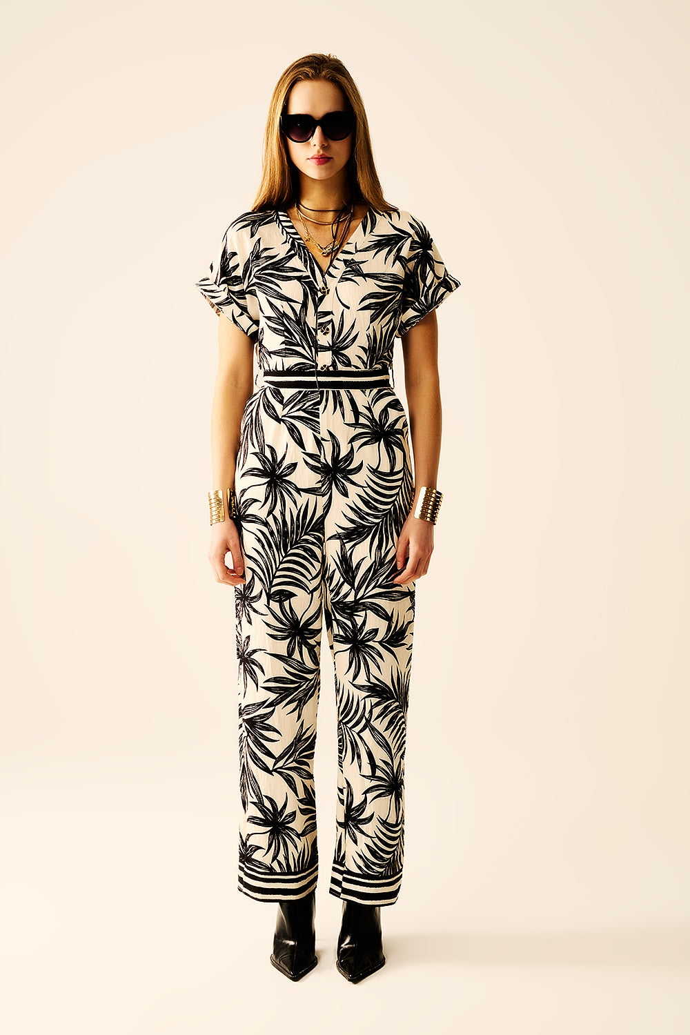 Combinaison à manches courtes avec motif tropical en noir et blanc
