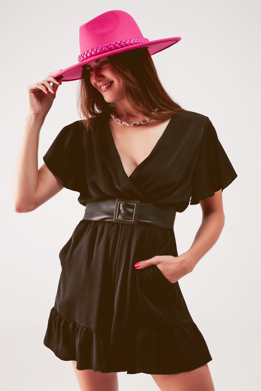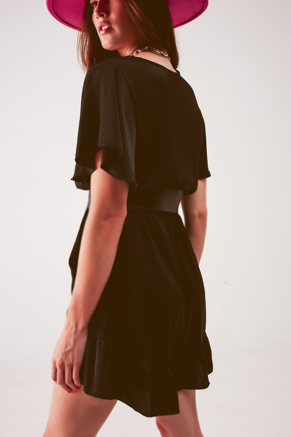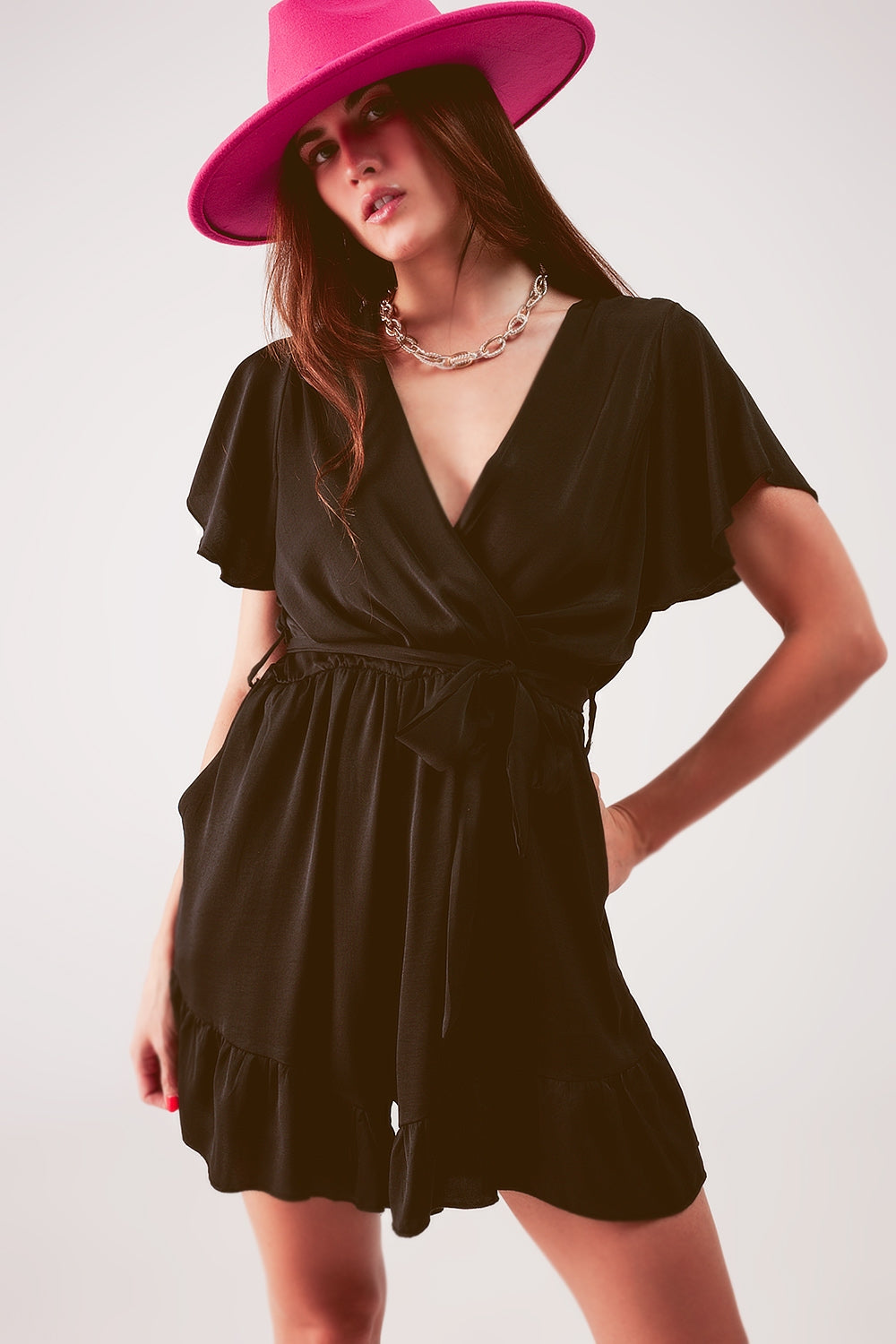 Bord : Bord à volants. Ceinture: Taille élastique. Encolure Col V. Coupe: Devant croisé. détail: Ceinture du même tissu incluse. détails du produit: Poches fonctionnelles. Fermeture : Fermeture par lien au dos. longueur: longueur pantacourt. Manches: Manches style ange. Poches: Poches sur les côtés. Combishort. Style: Style romantique. Tissu: Tissu brillant effet satin .