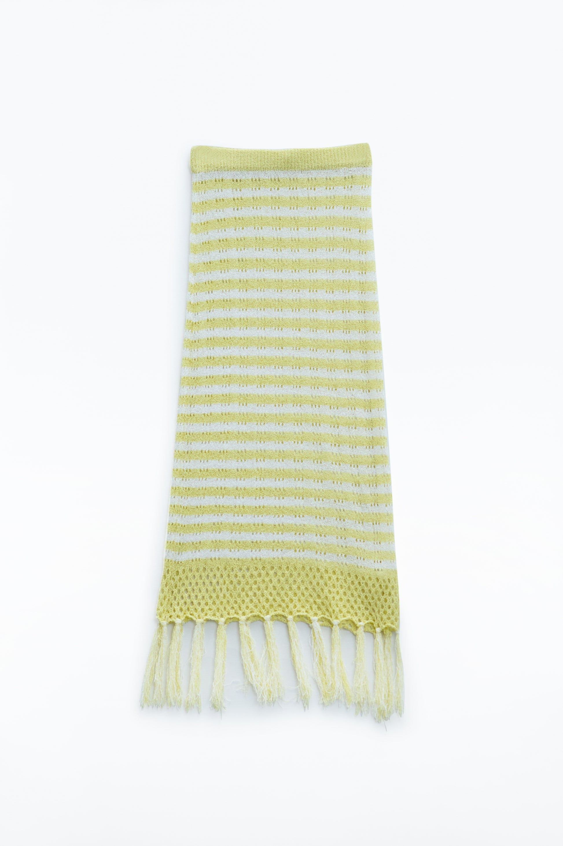 Jupe midi en crochet blanche à rayures jaunes et ourlet à franges