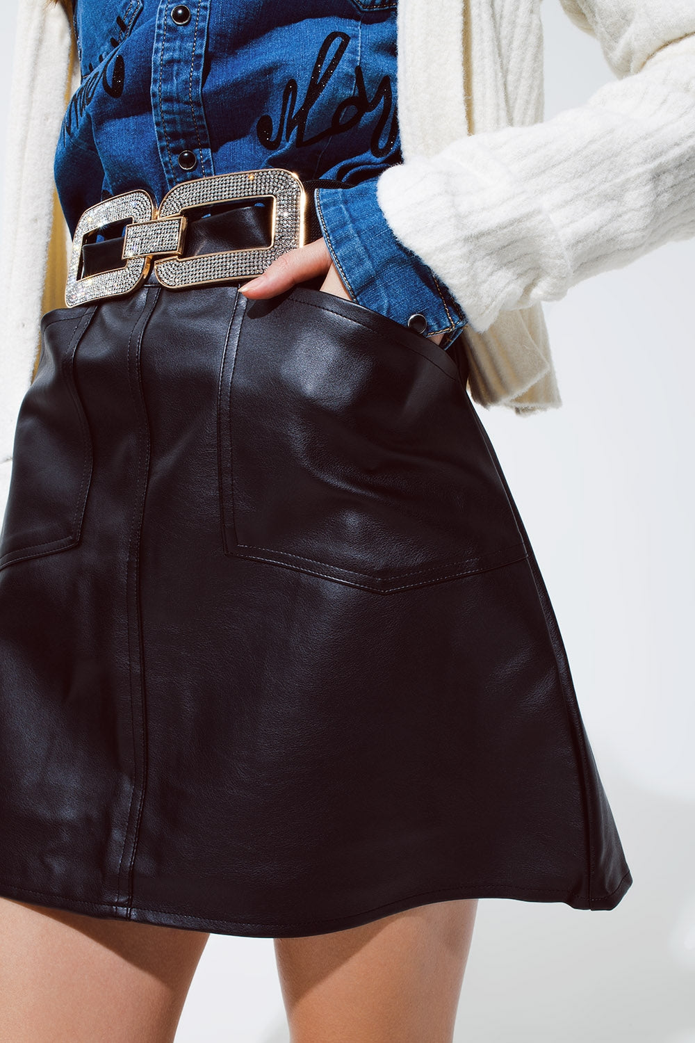 longueur: Longueur Mini. Jupe. Coupe: Coupe évasé. Style: Style de tous les jours. Tissu: faux cuir. Poches: Poches sur les côtés. Fermeture : Fermeture éclair au dos.