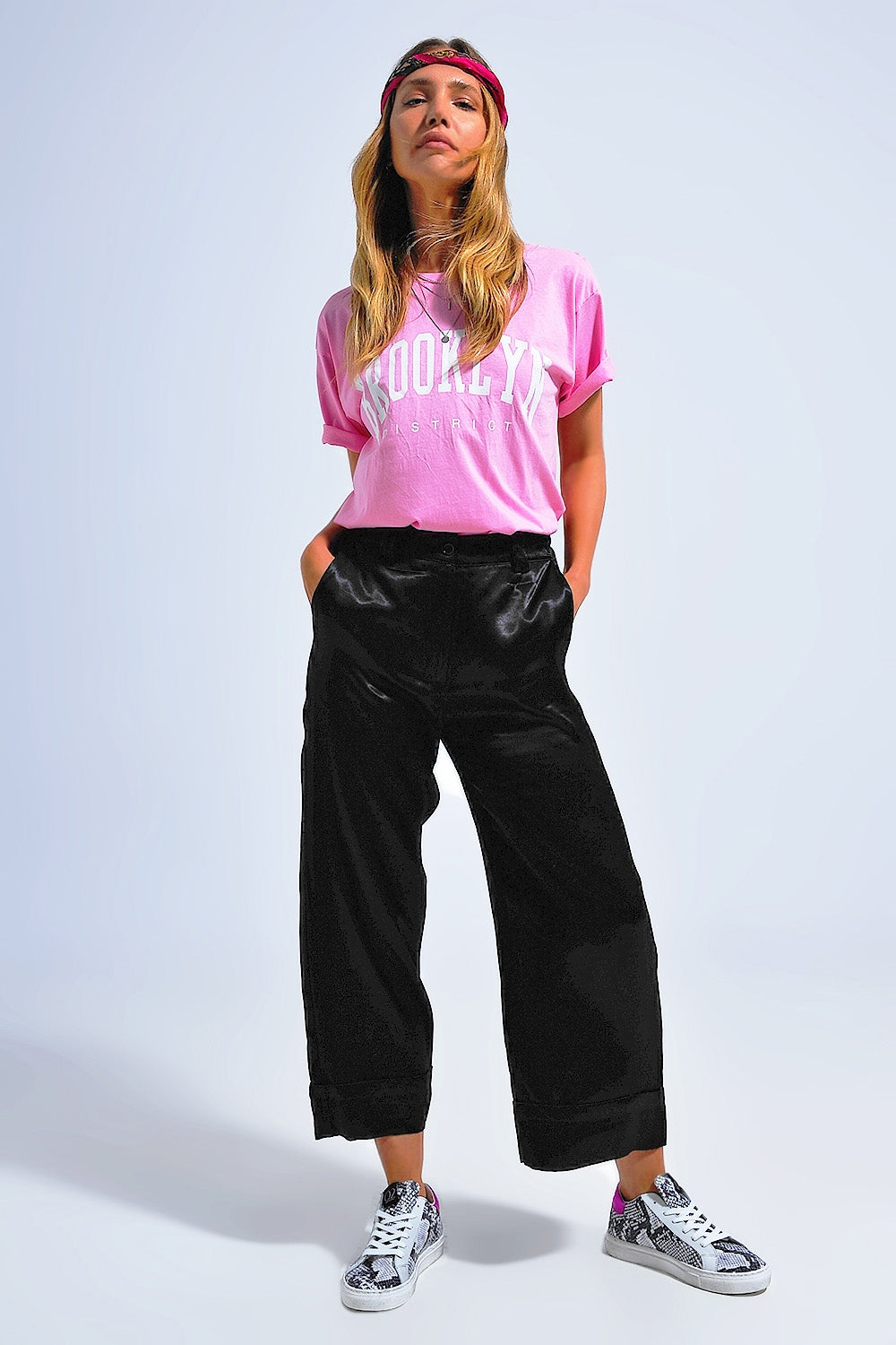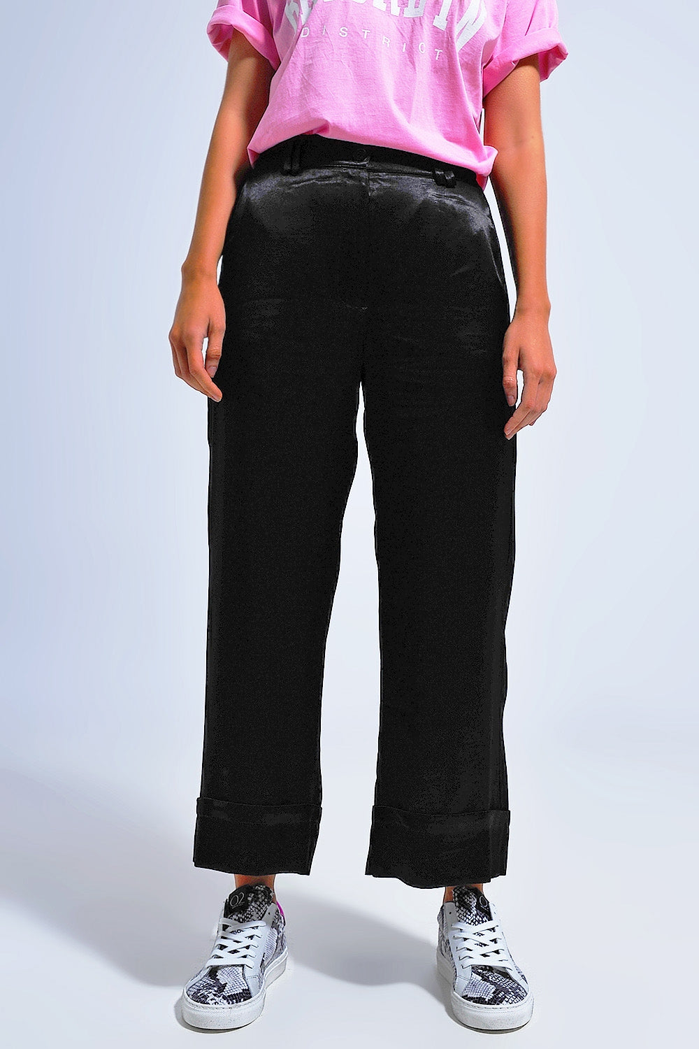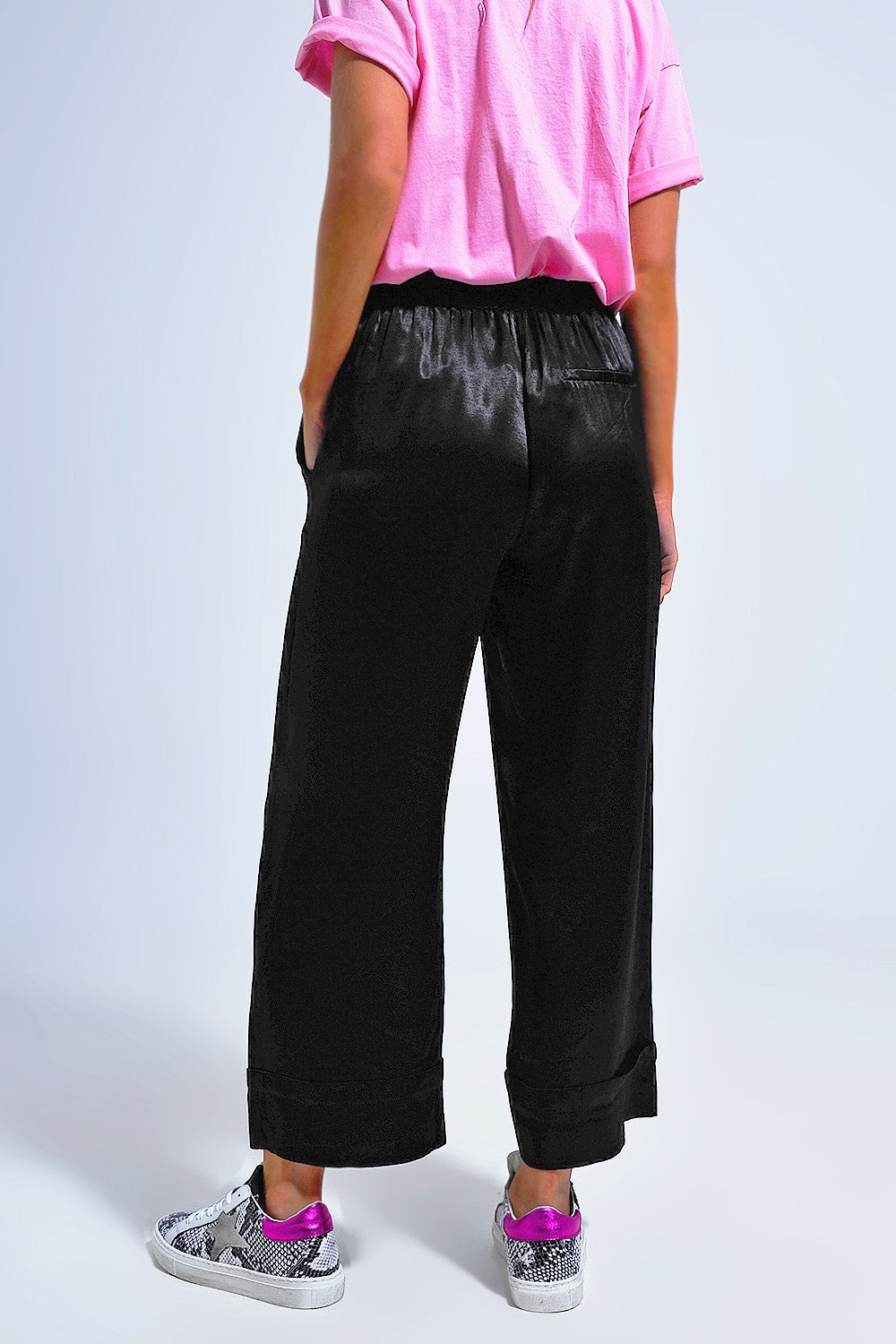 Bord : couture à revers. Ceinture: Élastique à l'arrière. Coupe: Coupe décontractée. détail: Passants pour ceinture. détails du produit: Poches fonctionnelles. Fermeture : Fermeture zippée. Jambe: Large. longueur: Longueur chevilles. Poches: Poches latérales et arrières. Pantalon. Style: Style de fête. Tissu: Tissu brillant effet satin .