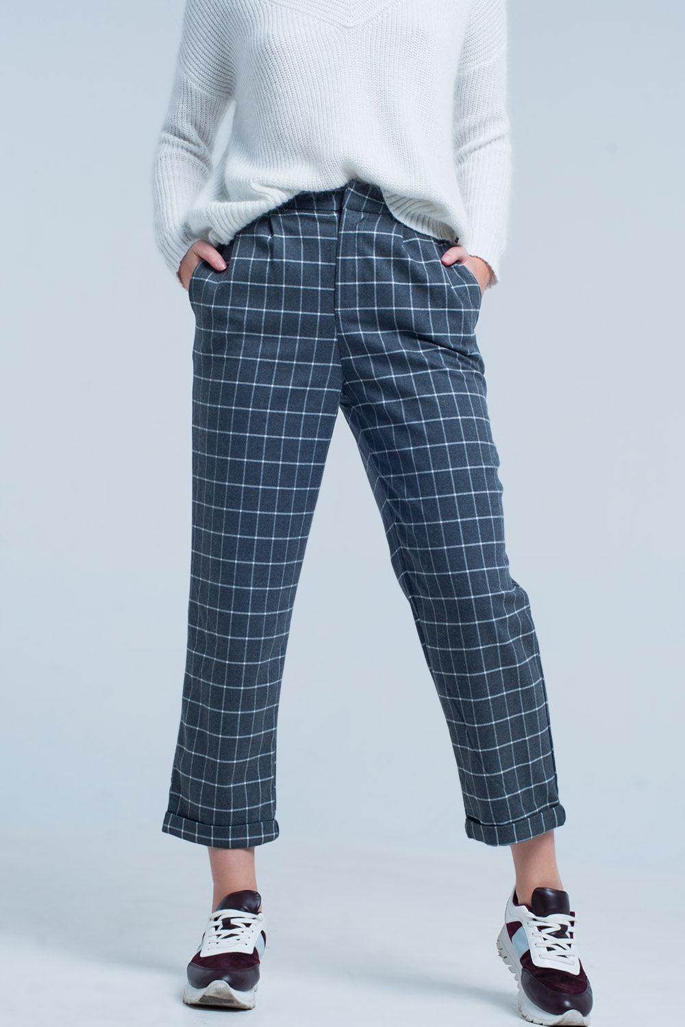 Pantalon gris à carreaux blanc