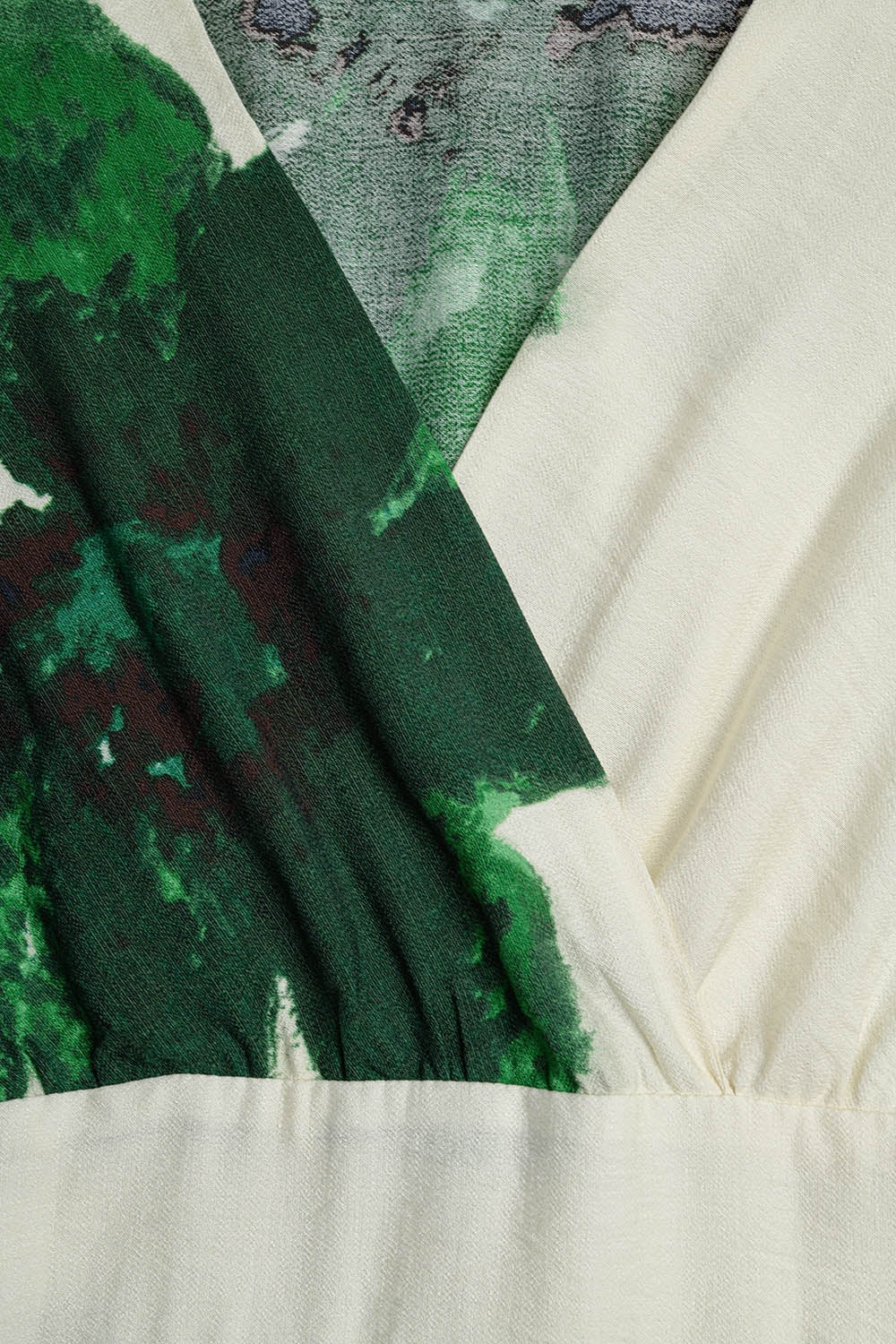 Robe longue enveloppante beige à imprimé floral tropical vert et manches longues