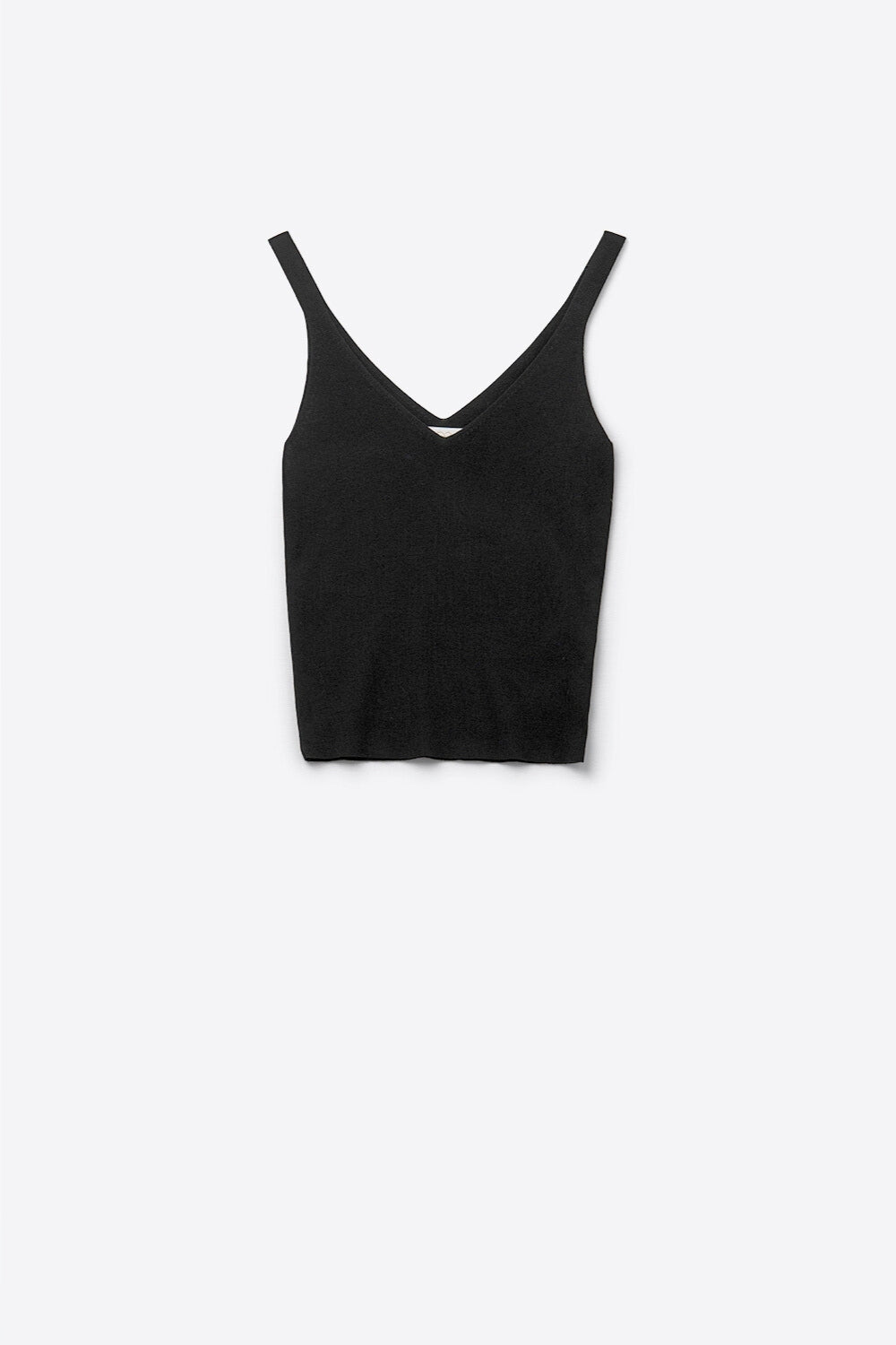 Top noir en tricot côtelé avec col en V et bretelles spaghetti