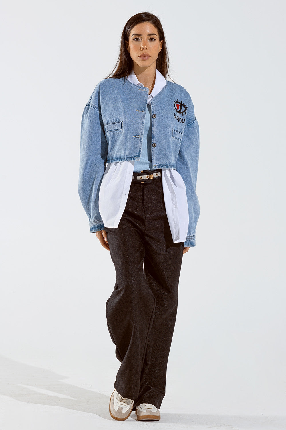longueur: longueur pantacourt. Veste en jean. Encolure ras de cou. Manches: Manches larges. Coupe: Coupe décontractée. Style: style urbain. Tissu: Denim rigide non stretch. Poches: Poches sur le devant. Fermeture : Patte de boutonnage. détails du produit: Texte au dos.